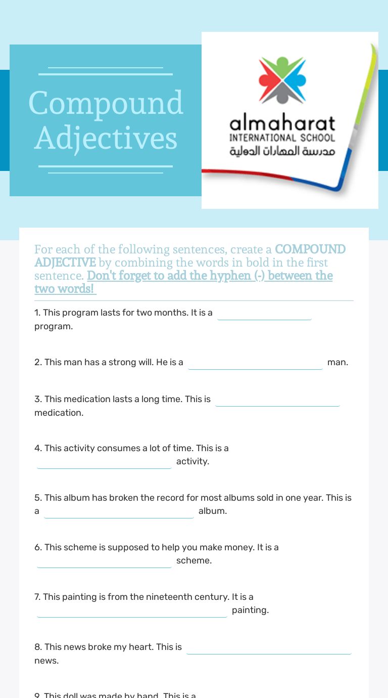 Many people look for help because they are · 4. Use a hyphen when the compound adjective comes before the noun it modifies, but not when it comes after the noun. Compound adjectives worksheet · planit y6 term 1a w6: Here are three randomly selected questions from a larger exercise, which can be edited, printed to create an exercise worksheet, or sent via email to friends or . A collection of english esl worksheets for home learning, online practice, distance learning and english classes to teach about compound, adjectives, .